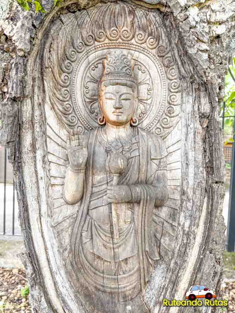 La figura tallada en el árbol representa a Kannon, una manifestación femenina de Buda que, en la tradición japonesa, simboliza la compasión y la misericordia. Este personaje espiritual es ampliamente venerado en el budismo, especialmente en Japón, donde se le reconoce como una fuente de consuelo y guía para quienes buscan alivio en momentos difíciles.