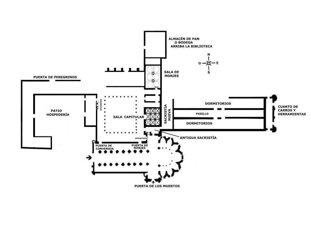 Las dependencias en los monasterios del Císter se encontraban separadas en dos, los monjes habitaban junto a la iglesia y los conversos en otras dependencias más alejadas de la iglesia. Ambas comunidades se comunicaban mediante el claustro: un espacio común a ambos.