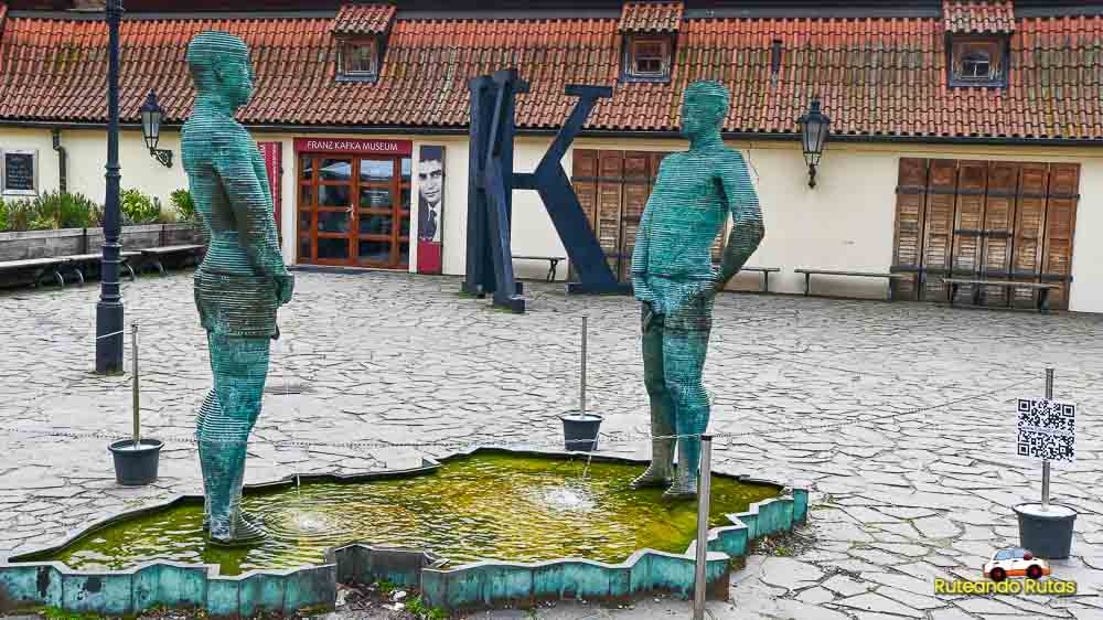 Es una escultura cinética de 2 hombres orinando frente al Museo Kafka, es quizás la obra más fotografiada de Cerny. Fundidos en bronce y con 2 m de altura, su pelvis gira y sus penes se mueven hacia arriba y hacia abajo mientras parecen que hacen pis en una piscina poco profunda con la forma de la República Checa. Lo que parecen meadas al azar son en realidad citas literarias checas que se escriben en el agua.