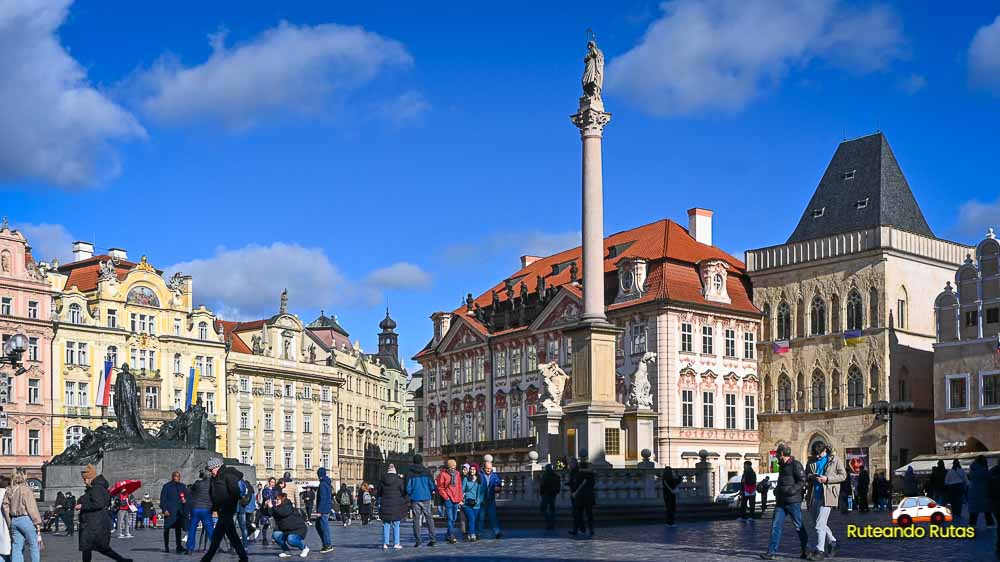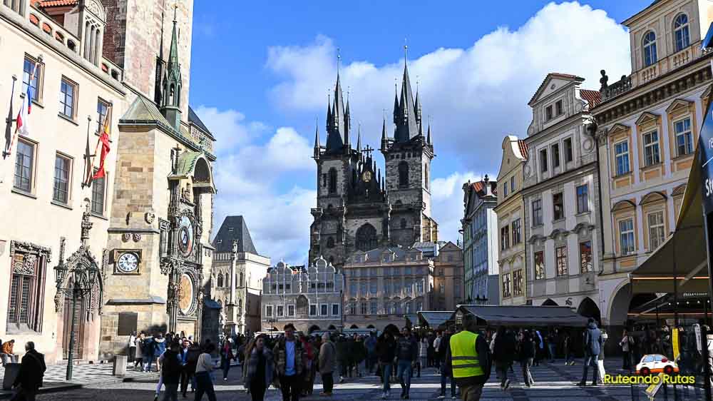Una gran plaza donde se encuentra: El Antiguo Ayuntamiento con el Reloj Astronómico, la Iglesia de Týn.