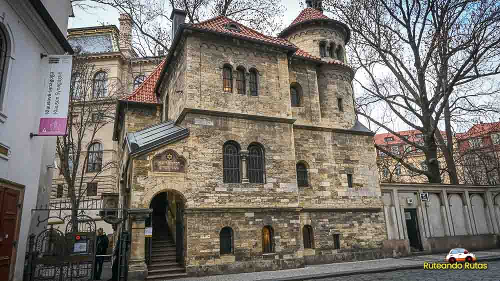 - la Española, construida en 1868 en estilo mudéjar, en el lugar que ocupaba un antiguo oratorio judío conocido como «la vieja escuela“. En los años 1836–1845, todavía funcionaba la vieja escuela, y en ella ejercía como organista František Škroup, compositor del himno checo. Destaca su decoración repleta de mosaicos moriscos. Al lado mismo se encuentra una de las obras del escultor Jaroslav Róna Monumento a Kafka