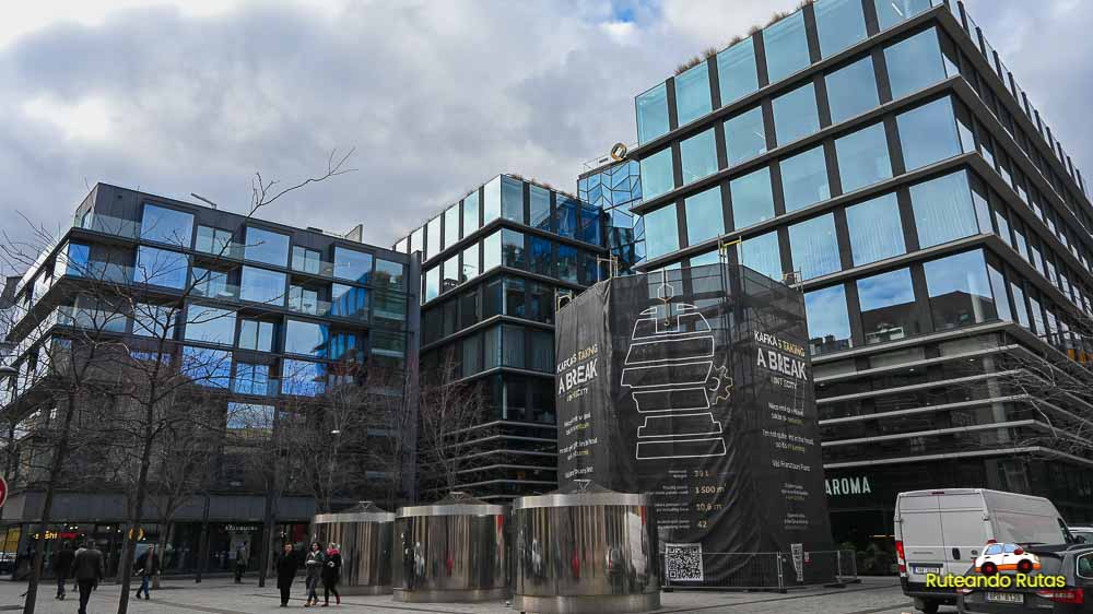 La cabeza giratoria de Franz Kafka, es una gran estructura de 10 m de altura, está compuesta por 42 planchas espejadas de acero inoxidable que van rotando a cada hora en punto y durante 15 minutos formando el busto de Franz Kafka. Se inspira en su novela corta más famosa, la Metamorfosis. Cuando fuimos estaban en obras….