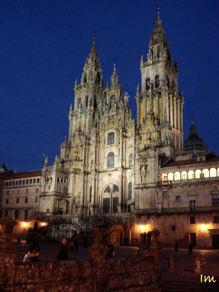 La fachada que veis de la Catedral era conocida en el Códex Calixtino del siglo XII como la Puerta del Paraíso, ya que en ella reproduce la historia de Adán y Eva, fue reformada en el siglo XVIII con estilo barroco y neoclásico. Frente a ella había una fuente en la que se lavaban los peregrinos antes de entrar a la catedral.